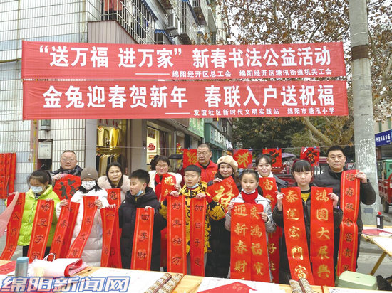 1月14日,友誼社區(qū)聯(lián)手塘汛小學(xué)開展“金兔迎春賀新年春聯(lián)入戶送祝福”活動,把濃濃的年味和新春的祝福送給轄區(qū)居民?;顒又?,塘汛小學(xué)的老師、學(xué)生們揮毫潑墨,一張張力透紙背的“福”字和一副副對仗工整、寓意吉祥的春聯(lián),帶著濃濃的墨香,洋溢著新春的喜氣,志愿者們幫忙將寓意吉祥的春聯(lián)和“福”字送到居民手中,大家臉上洋溢著喜悅的笑容。