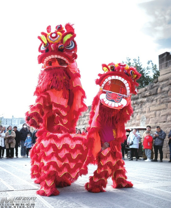 “好!”“再來一個!”正月初五,潼川古城醬園廣場不時傳來叫好聲,一場舞獅民俗表演引來水泄不通的人群。兩只“雄獅”配合默契,搔癢、打滾、掏耳朵、騰躍、翻滾……贏得現(xiàn)場游客陣陣歡呼和鼓掌。
