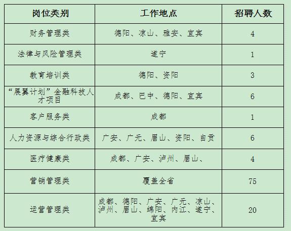 四川省公司省本部及下轄機(jī)構(gòu)共計(jì)擬招聘120人,崗位涵蓋“展翼計(jì)劃”銷售管理人才項(xiàng)目、“展翼計(jì)劃”金融科技人才項(xiàng)目、營(yíng)銷管理類、醫(yī)療健康類、運(yùn)營(yíng)管理類、財(cái)務(wù)管理類、客戶服務(wù)類、法律與風(fēng)險(xiǎn)管理類、教育培訓(xùn)類、人力資源與綜合行政類等各類崗位,工作地點(diǎn)覆蓋全省。