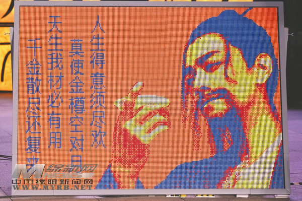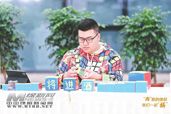 綿陽新聞網(wǎng)訊 近日,綿陽原創(chuàng)音樂劇《將進(jìn)酒》首演的第二天,“‘青’愛的綿陽,我們一起‘拼’”系列活動(dòng)在科技城人才公園展開,綿陽魔方達(dá)人張濤在現(xiàn)場轉(zhuǎn)動(dòng)魔方,拼創(chuàng)完成音樂劇中的李白劇照形象。