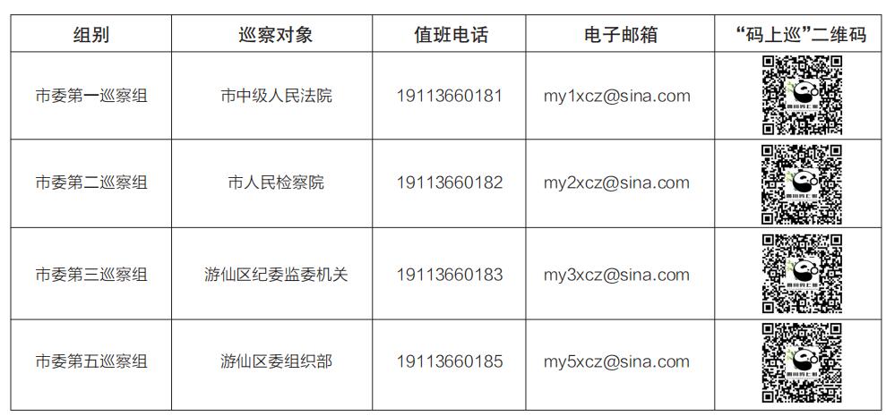 現(xiàn)將八屆市委第五輪巡察第二批次各巡察組分組名單、聯(lián)系方式及“碼上巡”二維碼公告如下,歡迎廣大干部群眾如實反映有關(guān)情況和問題。
