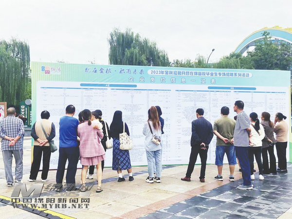 招聘會現(xiàn)場人頭攢動,大家紛紛聚集在職位一覽表前,只見綿陽人才集團(tuán)、郵政儲蓄及其子公司,美樂集團(tuán)、綿陽雙匯有限公司等知名企業(yè)赫然在列,求職者們仔細(xì)查看企業(yè)崗位信息,互相交流。