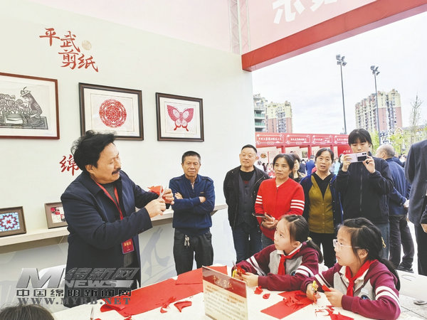 在非遺進(jìn)校園成果展現(xiàn)場,集中展示了近年來綿陽非遺進(jìn)校園取得的成果及活動圖像,平武剪紙傳承人謝成飛向到場的市民開展剪紙培訓(xùn)教學(xué)。接下來幾天,鑫田糧藝、三臺剪紙、羌族草編、綿陽拼布等項(xiàng)目傳承人也將開展現(xiàn)場培訓(xùn)教學(xué)。