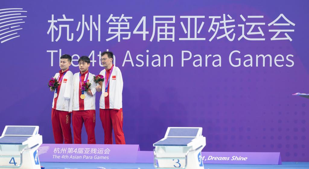 10月25日,冠軍中國(guó)選手楊洪(中)、亞軍王金剛(左)和季軍賈紅光(右)在男子200米個(gè)人混合泳-SM6級(jí)頒獎(jiǎng)典禮上。新華社記者才揚(yáng)攝