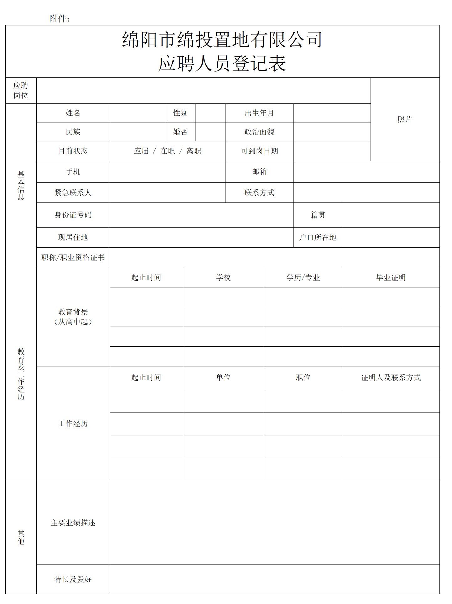 綿陽市綿投置地有限公司應(yīng)聘人員登記表
