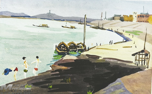 一輪紅日躍出云層,霞光映照在粼粼江面,對岸若隱若現(xiàn)的造船廠、晨光薄霧中的遠(yuǎn)山,與近處岸邊的貨運碼頭、江邊洗衣服的大姐大媽們,形成一幅絕美的畫面。王裕谷忍不住心中一喜,趕緊拿出畫筆勾勒起來。