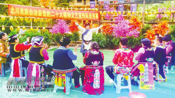 北川志愿服務(wù)總隊(duì)在青片鄉(xiāng)西窩羌寨開展黨的二十大精神文藝宣講活動(dòng)