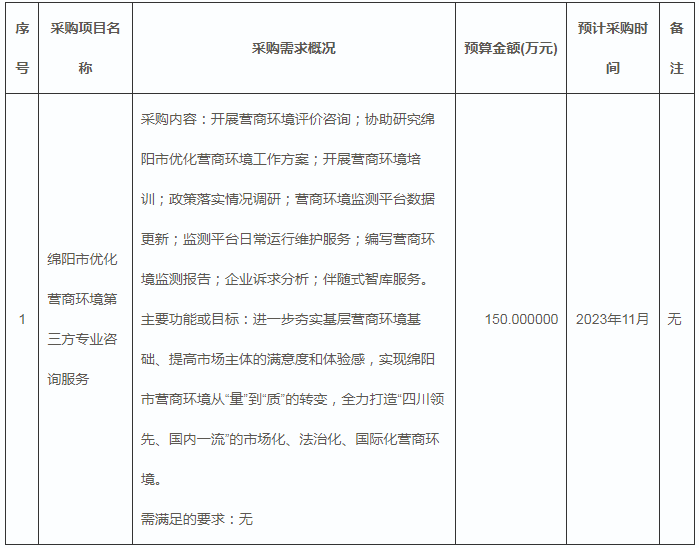 為便于供應商及時了解政府采購信息,根據(jù)《四川省財政廳關于開展政府采購意向公開工作的通知》(川財采〔2021〕153號)要求,現(xiàn)將綿陽市政務服務監(jiān)督管理局2023年度(第6批)采購意向公開如下: