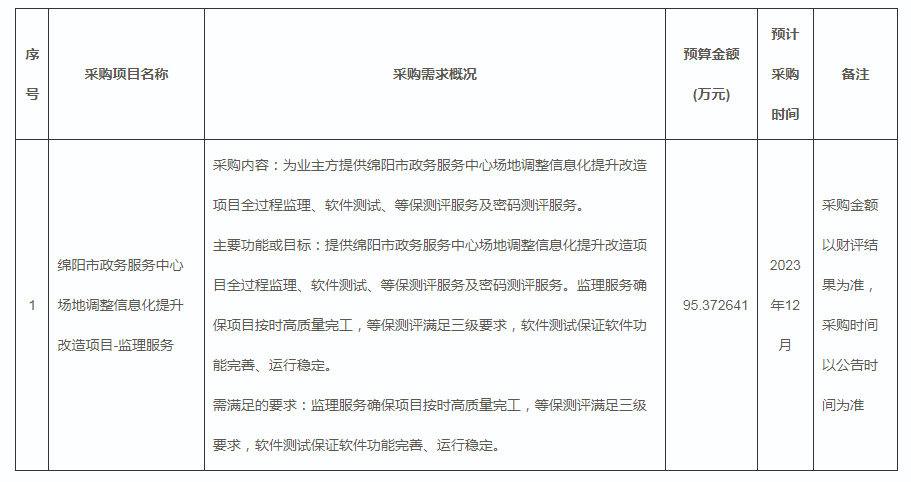 為便于供應(yīng)商及時了解政府采購信息,根據(jù)《四川省財(cái)政廳關(guān)于開展政府采購意向公開工作的通知》(川財(cái)采〔2021〕153號)要求,現(xiàn)將綿陽市政務(wù)服務(wù)監(jiān)督管理局2023年度(第7批)采購意向公開如下: