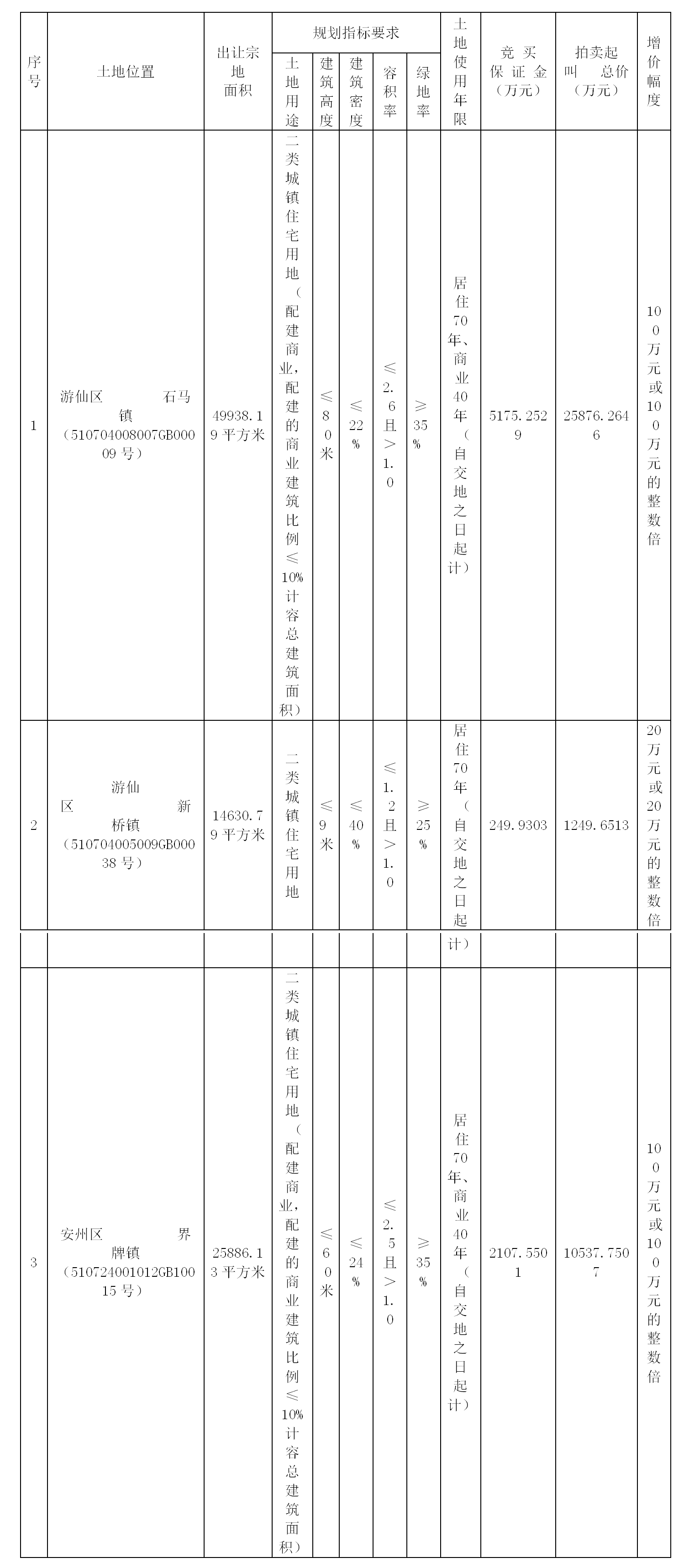 上述3宗地均以現(xiàn)狀出讓,1號(hào)宗地土地利用要求詳見(jiàn)《地塊規(guī)劃條件》(綿自然資規(guī)設(shè)〔2023〕265號(hào)),2號(hào)宗地土地利用要求詳見(jiàn)《地塊規(guī)劃條件》(綿自然資規(guī)設(shè)〔2023〕249號(hào))及《規(guī)劃審查意見(jiàn)》(綿自然資規(guī)審〔2023〕752號(hào)),3號(hào)宗地土地利用要求詳見(jiàn)《地塊規(guī)劃條件》(綿自然資規(guī)設(shè)〔2023〕267號(hào))。