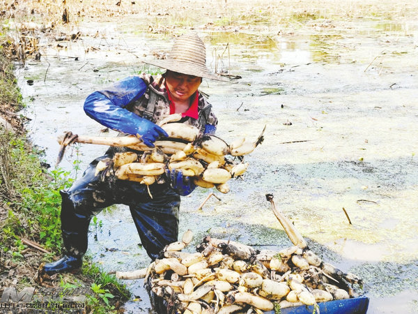 他們弓腰伸手,順著倒伏的殘荷莖稈,熟練地從淤泥深處掏出一根根蓮藕,然后手持高壓水槍給蓮藕“淋浴”。轉(zhuǎn)眼工夫,“蓬頭垢面”的蓮藕被洗得干干凈凈,再打包裝車(chē),運(yùn)往周邊各大市場(chǎng)。
