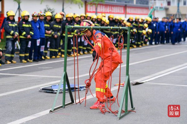 15支隊(duì)伍,200余名消防指戰(zhàn)員參加60米肩梯上二樓、百米障礙救助操、多種救生繩快速打結(jié)、槍炮協(xié)同滅火操、樓層內(nèi)攻操等7個(gè)科目的對(duì)抗賽。同時(shí)還進(jìn)行了5000米跑,400米疏散物資,負(fù)重登樓和理論考核。