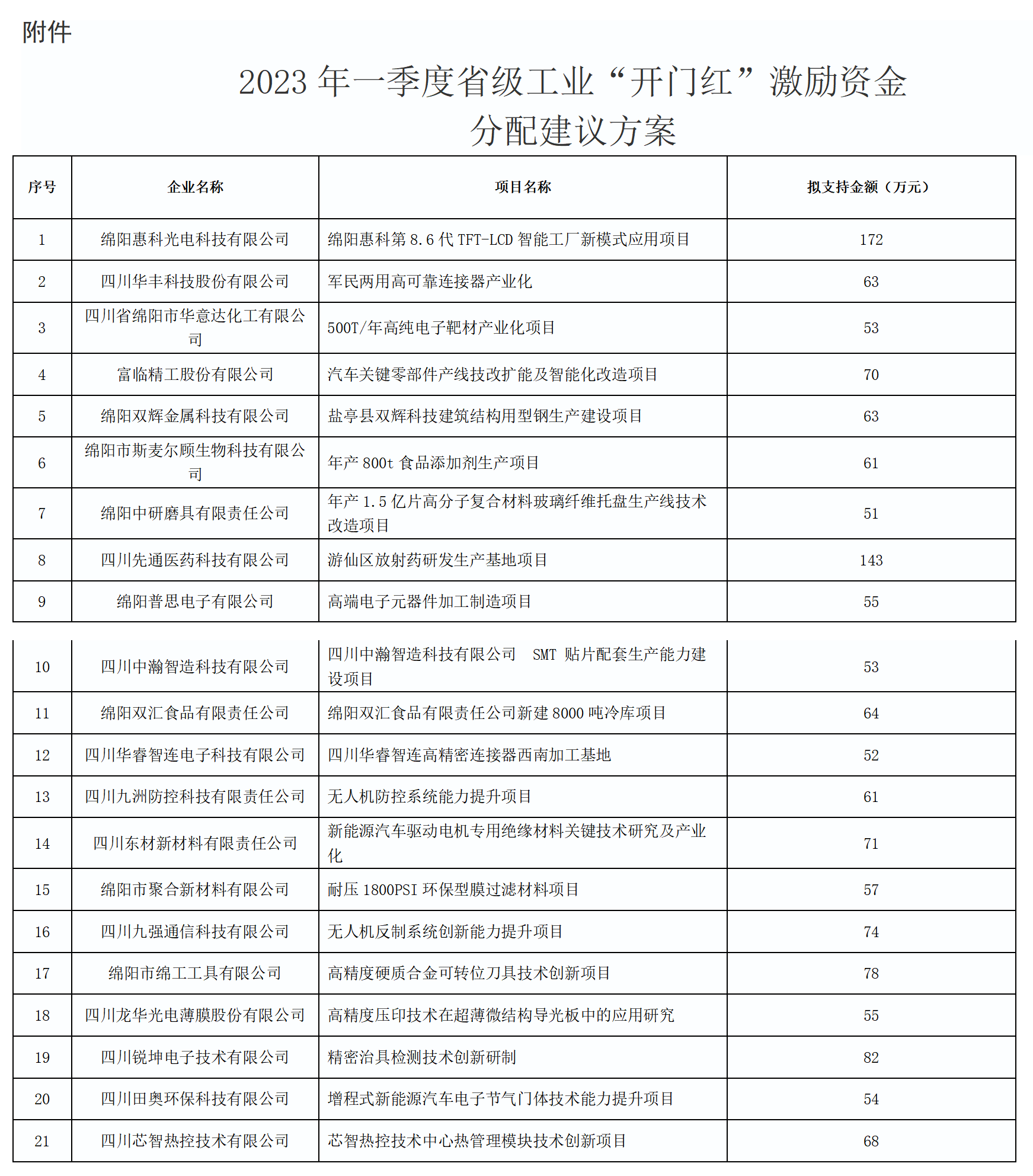 根據(jù)財政廳《關(guān)于下達(dá)2023年第一批省級工業(yè)發(fā)展專項資金的通知》(川財建〔2023〕156號)、經(jīng)信廳《關(guān)于做好2023年第一批省級工業(yè)發(fā)展專項資金管理工作的通知》相關(guān)要求,市經(jīng)濟(jì)和信息化局組織開展了2023年一季度省級工業(yè)“開門紅”激勵資金申報工作。經(jīng)企業(yè)自主申報,相關(guān)縣(市、區(qū))、園區(qū)經(jīng)濟(jì)和信息化主管部門推薦,市經(jīng)濟(jì)和信息化局審核,專家答辯評審及現(xiàn)場核實,2023年一季度省級工業(yè)“開門紅”激勵資金擬支持項目21個,現(xiàn)予以公示。