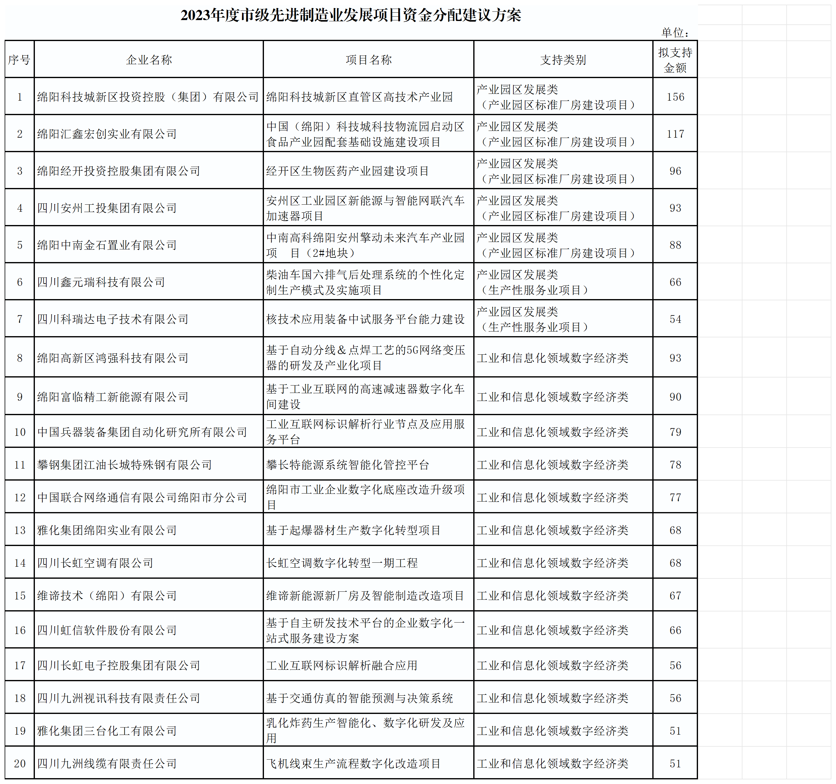 根據(jù)市經(jīng)信局《關(guān)于印發(fā)綿陽(yáng)市2023年度市級(jí)先進(jìn)制造業(yè)發(fā)展項(xiàng)目資金申報(bào)指南的通知》(綿經(jīng)信財(cái)資〔2023〕491號(hào))要求,通過企業(yè)自主申報(bào),縣市區(qū)(園區(qū))工業(yè)經(jīng)濟(jì)主管部門初審?fù)扑],經(jīng)相關(guān)科室審核、專家評(píng)審、現(xiàn)場(chǎng)核查和市經(jīng)信局黨組會(huì)審議等程序?,F(xiàn)對(duì)擬支持的20個(gè)企業(yè)(項(xiàng)目)名單予以公示。