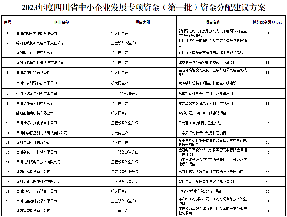 根據(jù)市經(jīng)信局《關(guān)于做好2023年度四川省中小企業(yè)發(fā)展專項資金(第一批)申報工作的通知》(綿經(jīng)信企業(yè)〔2023〕578號)要求,通過企業(yè)自主申報,縣(市、區(qū))、園區(qū)工業(yè)經(jīng)濟主管部門初審?fù)扑],經(jīng)相關(guān)科室審核、專家評審、現(xiàn)場核查和市經(jīng)信局黨組會審議等程序?,F(xiàn)對擬支持的19家企業(yè)(項目)名單予以公示。