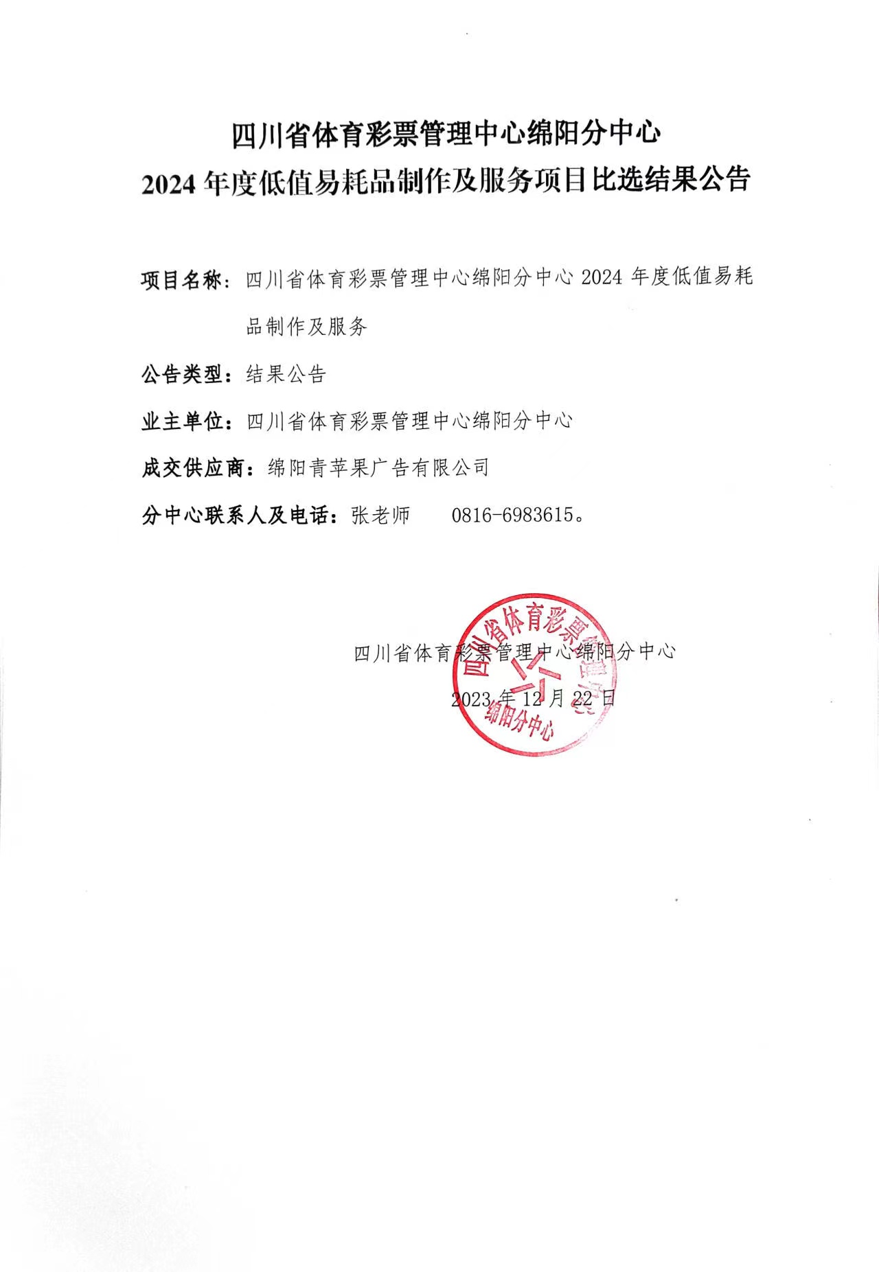 四川省體育彩票管理中心綿陽分中心2024年度低值易耗品制作及服務(wù)項(xiàng)目比選結(jié)果公告