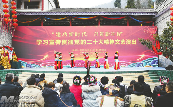“鄉(xiāng)親們,仔細(xì)聽,黨的二十大精神記在心;新時代、新征程,與黨同心啟航程;新觀點、新論斷,中國變化世界贊;新思想、新戰(zhàn)略,新的要求聽我說……”北川青片鄉(xiāng)西窩羌寨58歲的非遺傳承人梁元斌,自編自演羌族“打岔”非遺節(jié)目《禮贊黨的二十大》,用耳熟能詳?shù)姆绞剑瑢Ⅻh的二十大精神傳遞給家家戶戶。