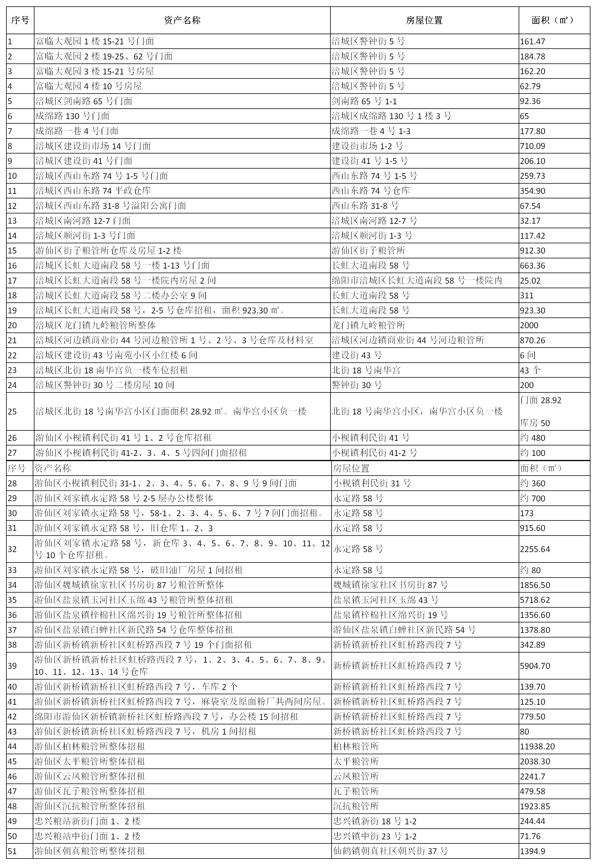 綿陽(yáng)市眾一糧油有限公司現(xiàn)有門面、倉(cāng)庫(kù)、住房及其他資產(chǎn)面向社會(huì)公開競(jìng)租(詳見競(jìng)租清單)。