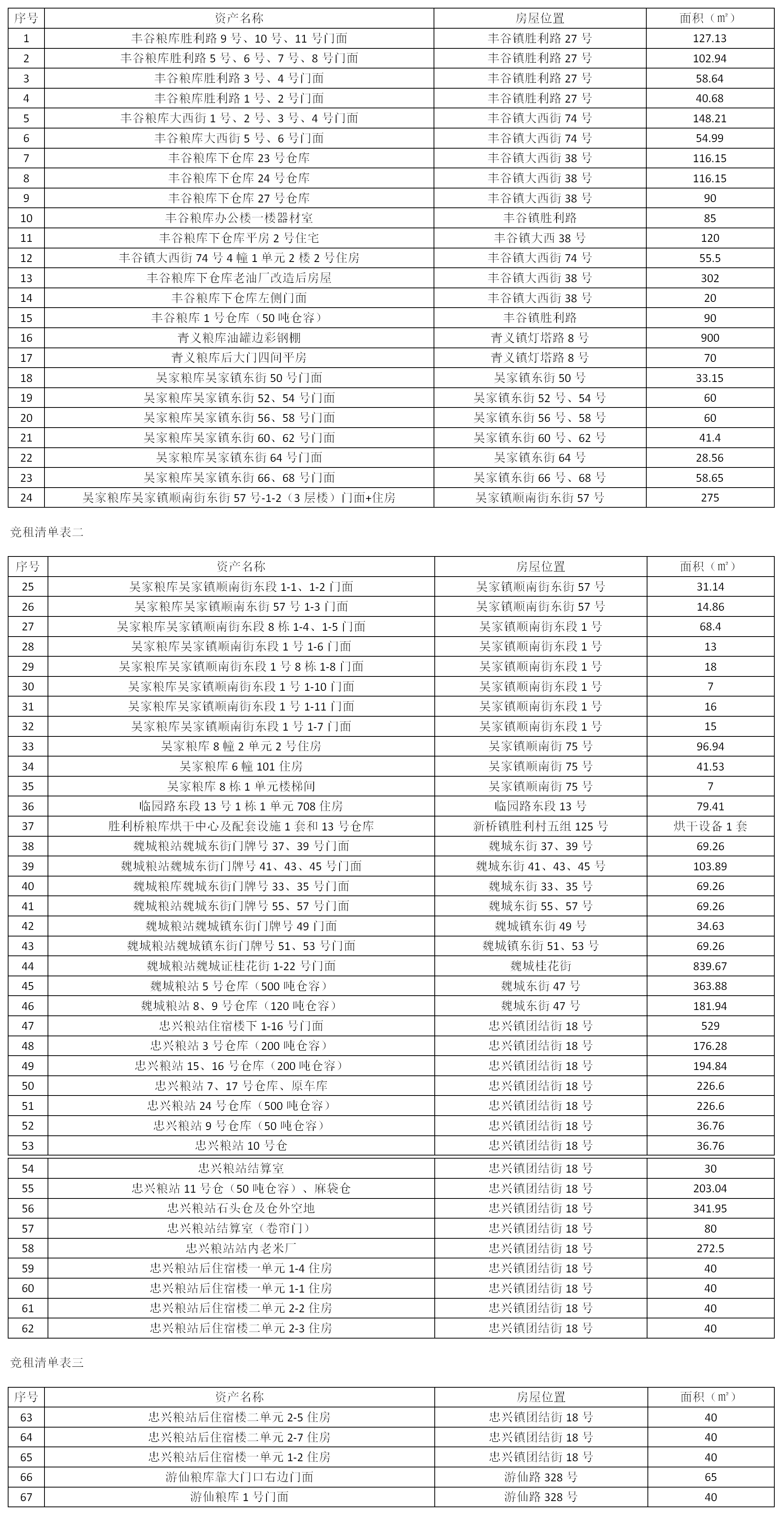綿陽市儲備糧管理有限公司現(xiàn)將公司權(quán)屬及所代管位于豐谷鎮(zhèn)、吳家鎮(zhèn)、青義鎮(zhèn)、忠興鎮(zhèn)、魏城鎮(zhèn)、游仙路328號及新橋鎮(zhèn)勝利村五組125號的部分資產(chǎn)面向社會進行公開競價招租(詳見競租清單表),現(xiàn)將有關(guān)事宜公告如下: