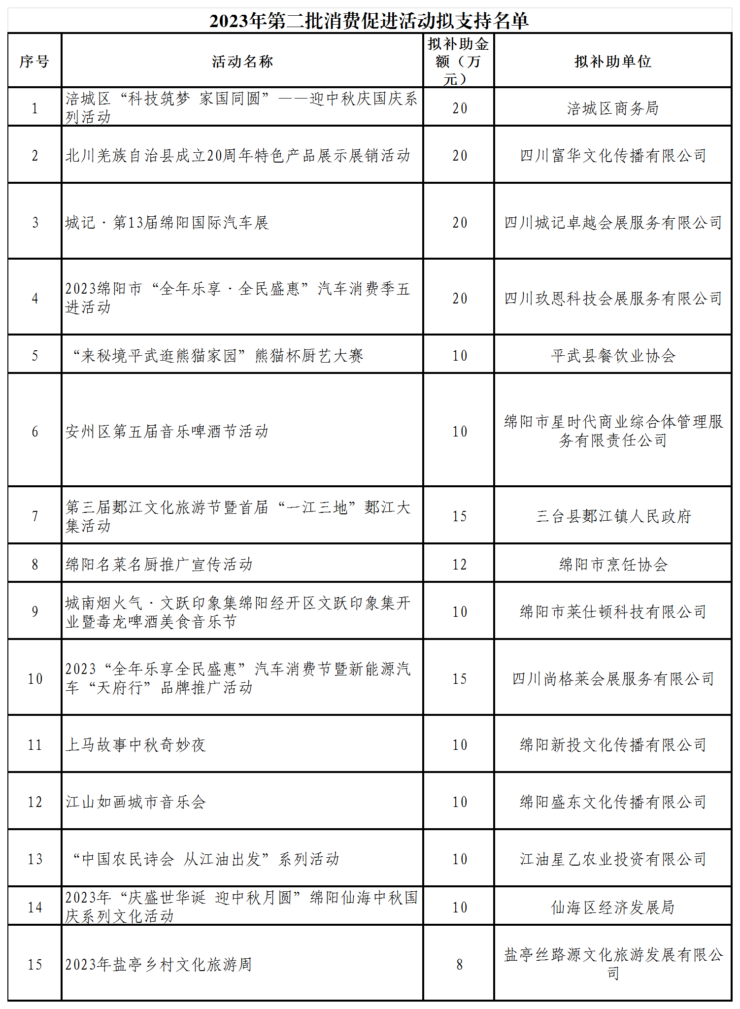 根據(jù)《綿陽市2023年第二輪消費券發(fā)放方案》,經(jīng)市場主體自主申報,相關縣(市、區(qū))、園區(qū)商務主管部門初審,綿陽市商務局組織專家評審,擬對8月31日-11月30日期間開展的15個消費促進活動予以支持,現(xiàn)將名單予以公示。