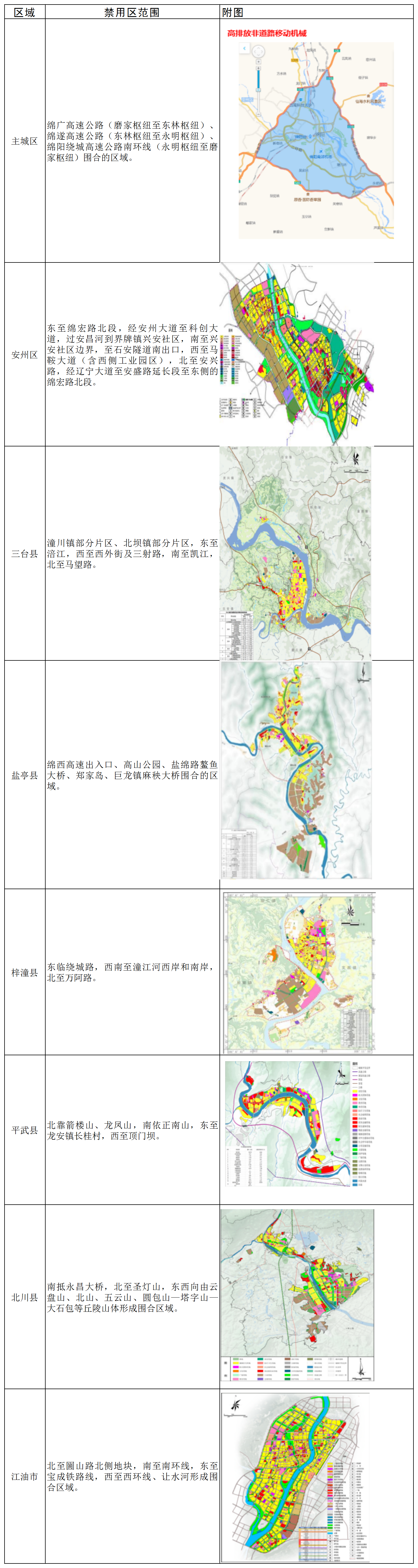 一、調(diào)整后的禁用區(qū)范圍:1.主城區(qū):綿廣高速公路(磨家樞紐至東林樞紐)、綿遂高速公路(東林樞紐至永明樞紐)、綿陽(yáng)繞城高速公路南環(huán)線(永明樞紐至磨家樞紐)圍合的區(qū)域;2.其余各縣(市、區(qū))城市建成區(qū)(見附圖)。