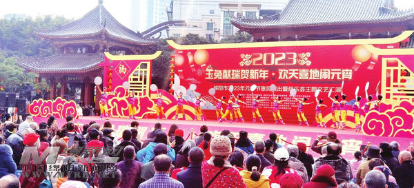 歌舞鬧春,元宵情濃。2月4日,正月十四,綿陽(yáng)市2023年元宵節(jié)惠民演出暨綿樂(lè)薈主題文藝匯演在鐵牛廣場(chǎng)舉行。群眾文藝演出、非遺展示、圖書(shū)閱讀服務(wù)等活動(dòng),讓市民“一站式”享受到節(jié)日的歡樂(lè)和公共文化的福利。
