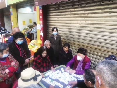 在這條街上,記者還看到一家門店外,十幾個人圍著一桌手搓麻將“觀戰(zhàn)”,街對面一堆人圍著一桌象棋七嘴八舌地討論著。百米之內(nèi),街道兩邊打麻將、下象棋、斗地主的人堆就有三處。