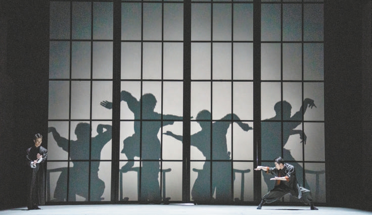電影感貫穿了舞劇《詠春》的始終,其中很多場景的呈現(xiàn)也能找出電影的影子。“這源于我們對詠春、對葉問的認知,對于我們80后來講,這些認知很多都來源于電影。”韓真、周莉亞以最精彩的“打通關(guān)”舞段為例,有的打斗段落被安排在屏風后的太師椅上,打斗的動作在屏風上顯出剪影,有的段落靈感來源于武俠電影里的巷戰(zhàn),還有的來源于竹林纏斗,都是武俠片中經(jīng)常出現(xiàn)的經(jīng)典對抗橋段。