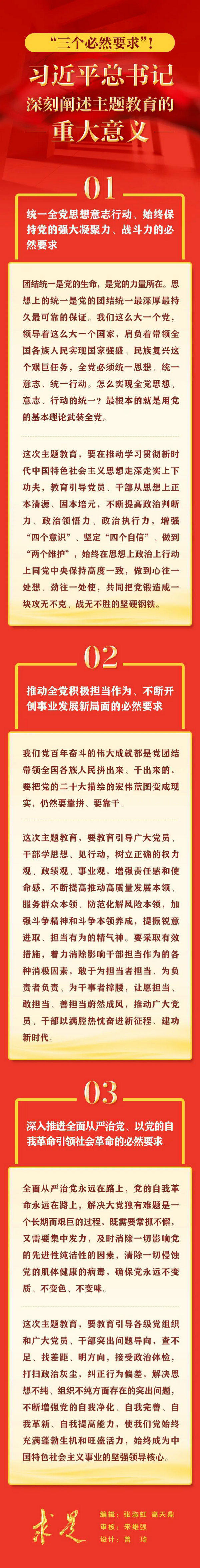 5月1日出版的第9期《求是》雜志刊發(fā)習(xí)近平總書記重要文章《在學(xué)習(xí)貫徹習(xí)近平新時(shí)代中國(guó)特色社會(huì)主義思想主題教育工作會(huì)議上的講話》。在這篇重要文章中,習(xí)近平總書記用“三個(gè)必然要求”深刻闡述開展這次主題教育的重大意義。