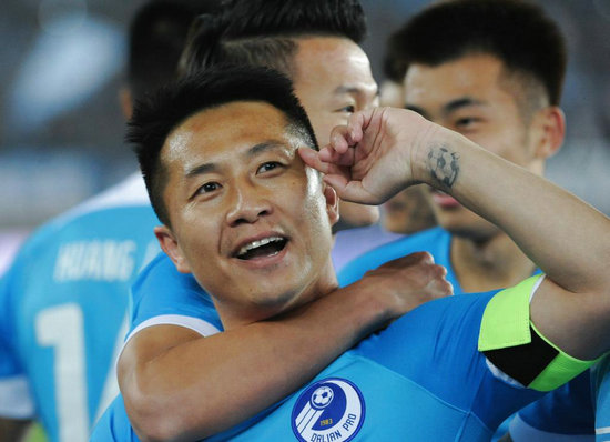 4月15日,大連人隊(duì)球員閻相闖在比賽中慶祝進(jìn)球。新華社記者 龍雷 攝
