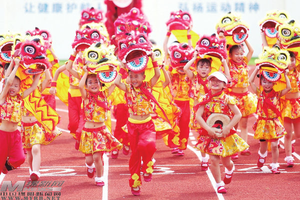 5月31日,涪城區(qū)金峰小學(xué),學(xué)生們?cè)诓賵?chǎng)上舞動(dòng)獅子,并制作以獅為主題的各類手工,共同慶祝節(jié)日。