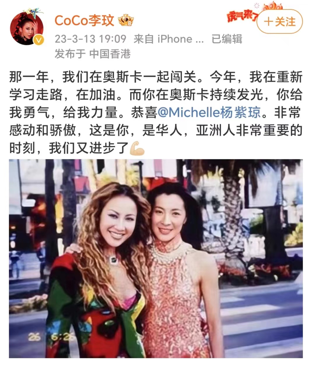 3月13日,李玟更新微博,恭賀楊紫瓊獲奧斯卡金像獎(jiǎng),成為首位華裔影后。