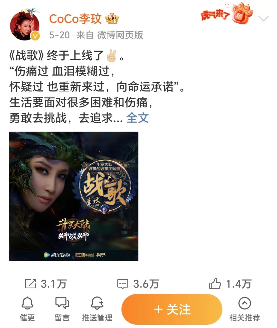 5月20日,新歌《戰(zhàn)神》上線。李玟的微博也停留在了這一天。