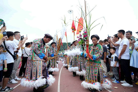6月23日,村民自發(fā)組成的民族歌舞表演隊(duì)盛裝吹蘆笙入場(chǎng)。新華社發(fā)(王炳真攝)
