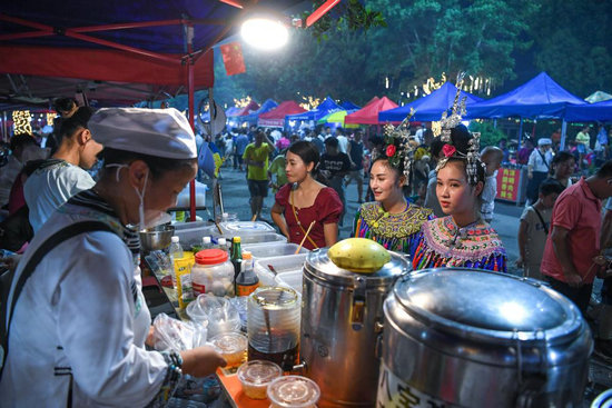 7月1日,游客在貴州“村超”足球賽場(chǎng)附近設(shè)置的免費(fèi)攤位購(gòu)買(mǎi)地方特色小吃。新華社記者 楊文斌 攝