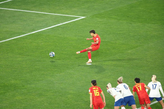 下半場開場階段,中國隊加強了進攻,連續(xù)獲得射門機會。在一次角球進攻中,英格蘭隊球員在禁區(qū)內(nèi)手球犯規(guī),主裁判判罰點球,王霜第57分鐘一蹴而就,為中國隊追回一球,這是她在本屆世界杯上的第二個進球,也是中國隊在本屆世界杯的所有進球。