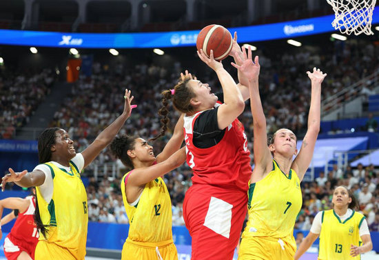 8月1日,中國隊球員劉禹彤(中)在比賽中上籃。新華社記者楊青攝