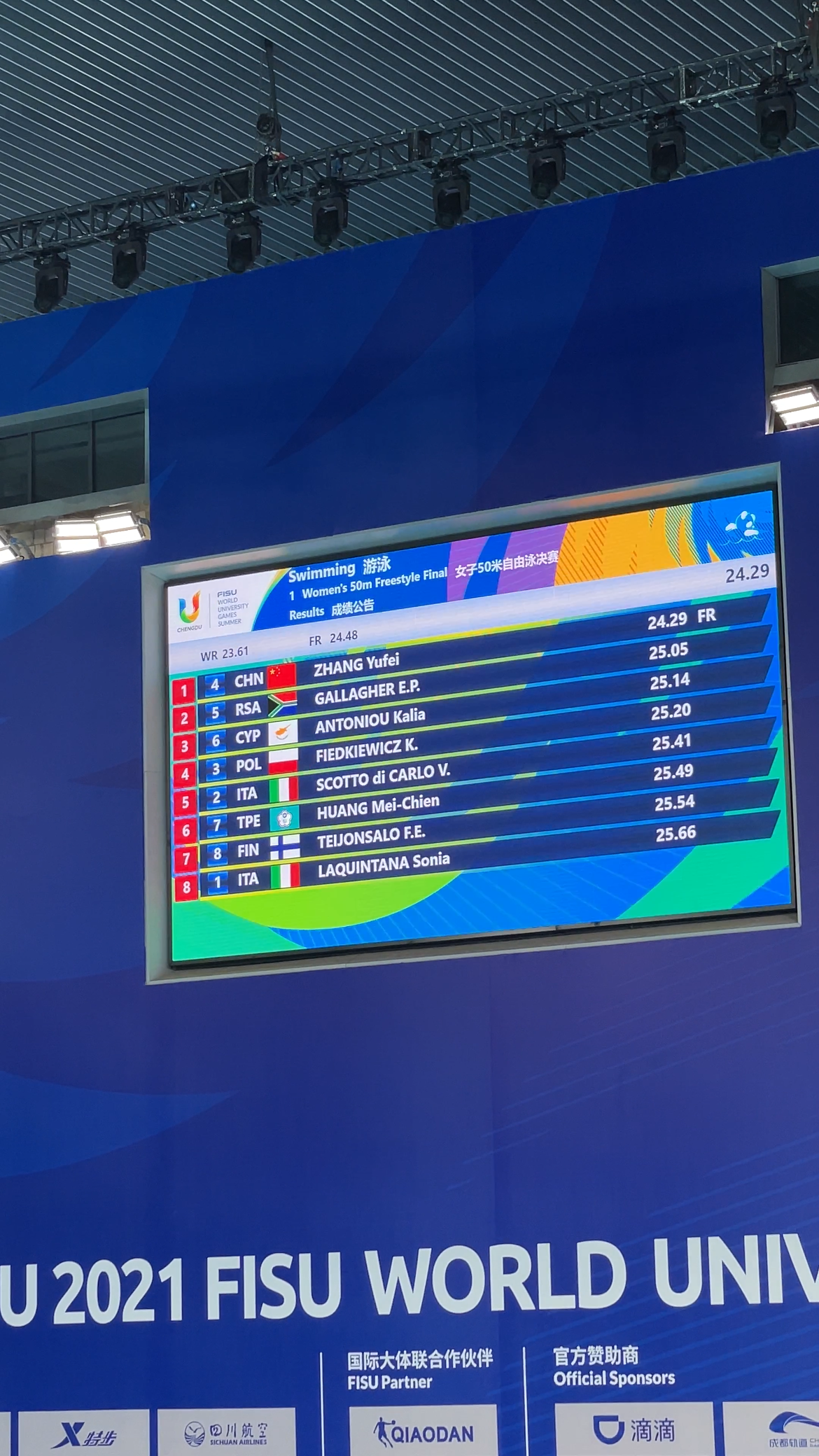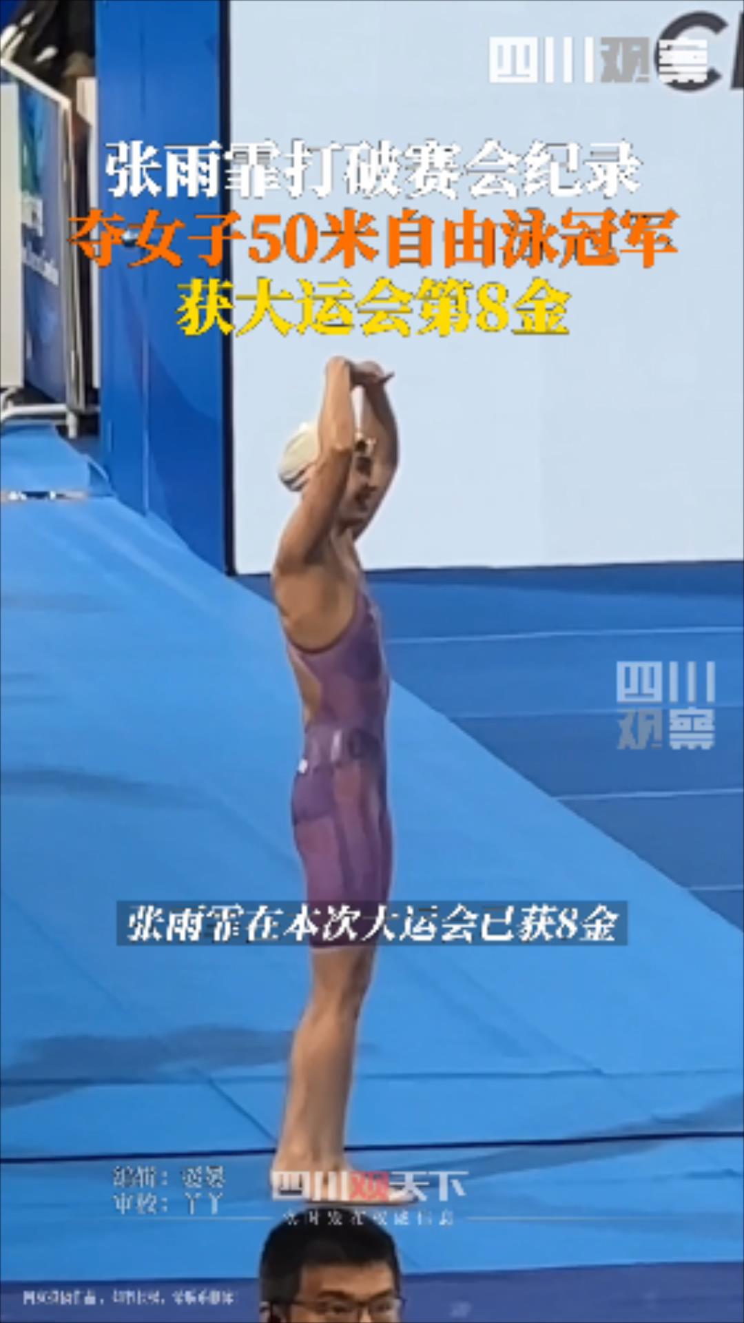 8月7日,成都大運(yùn)會(huì)女子50米自由泳項(xiàng)目決賽在東安湖體育公園游泳跳水館舉行,中國隊(duì)員張雨霏以24.29秒的成績(jī)奪得金牌,并打破世界大學(xué)生運(yùn)動(dòng)會(huì)該項(xiàng)目的紀(jì)錄,這也是張雨霏在本屆大運(yùn)會(huì)的第8金。