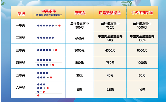 一等獎派獎總獎金1750萬,其中500萬元專項用于七夕特別獎期,由符合條件且中得一等獎的彩票按中獎注數(shù)均分。二等獎派獎總獎金200萬元,其中50萬元專項用于七夕特別獎期,由符合條件且中得二等獎的彩票按中獎注數(shù)均分。固定獎派獎總獎金3500萬元,其中500萬元專項用于七夕特別獎期,由符合條件且中得三至六等獎中任意獎級的彩票同時中得派獎獎金。七夕特別獎期外單注獎金最高提升50%,七夕特別獎期單注獎金最高可翻倍!活動期間,單票單期滿10元可參與(符合參與條件的多期票、套票、預(yù)售票按期參與)。