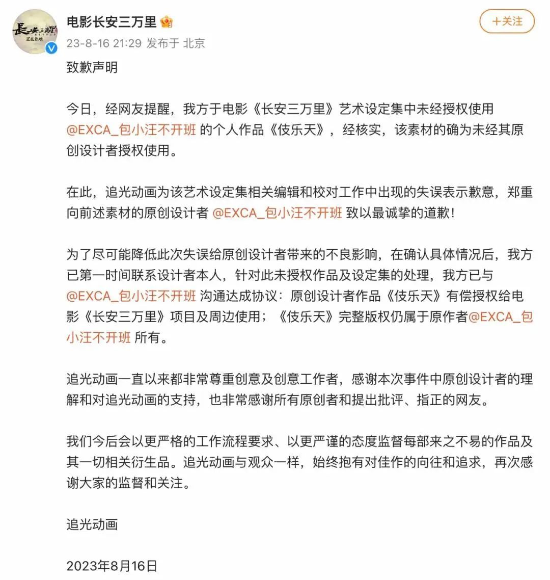 8月16日,@電影長安三萬里 發(fā)布致歉聲明:“經(jīng)網(wǎng)友提醒,我方于電影《長安三萬里》藝術(shù)設(shè)定集中未經(jīng)授權(quán)使用@EXCA_包小汪不開班 的個人作品《伎樂天》,經(jīng)核實,該素材的確為未經(jīng)其原創(chuàng)設(shè)計者授權(quán)使用。”