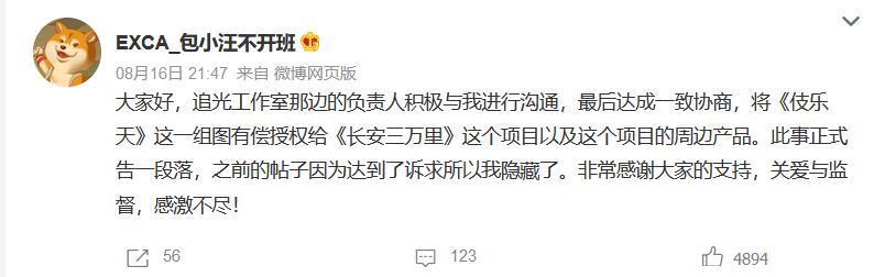 隨后,原作者發(fā)文表示已與片方達成和解,將《伎樂天》這一組圖有償授權(quán)給《長安三萬里》項目的周邊產(chǎn)品。