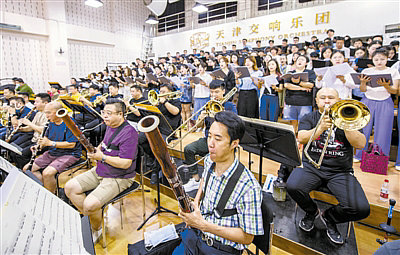 由市委宣傳部、市文化和旅游局主辦,天津交響樂團(tuán)攜交響詩篇《長城》,將于8月30日登陸國家大劇院。昨天,中央音樂學(xué)院合唱團(tuán)、北京音樂家協(xié)會合唱團(tuán)、天津音樂學(xué)院青年合唱團(tuán)、天津交響樂團(tuán)(附屬)合唱團(tuán)與樂團(tuán)演奏家組成的近300名參演人員,由樂團(tuán)團(tuán)長、指揮家董俊杰攜領(lǐng),在天交排練場進(jìn)行了演出前的首次排練。
