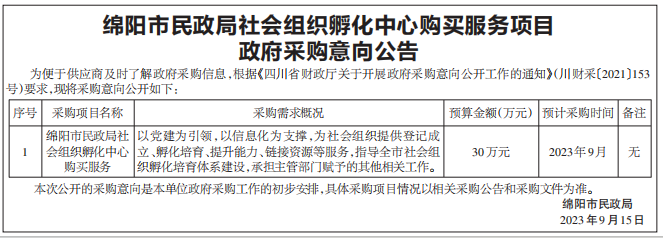 綿陽市民政局社會(huì)組織孵化中心購(gòu)買服務(wù)項(xiàng)目政府采購(gòu)意向公告