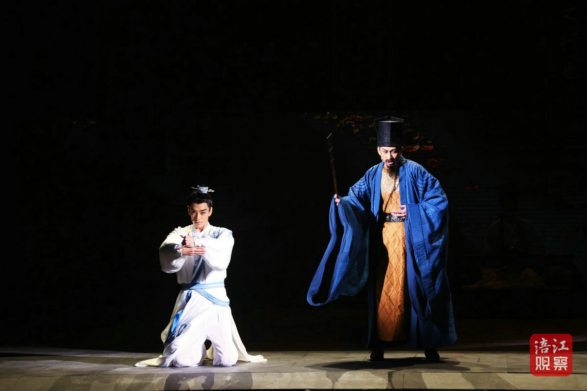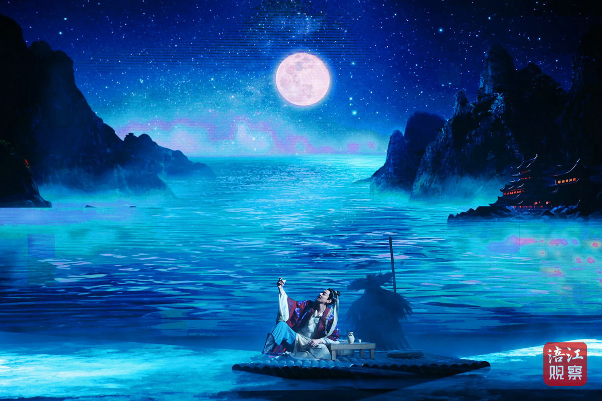 當(dāng)天19時30分,李白的人生故事隨著音樂聲啟幕。在四川綿陽的江油青蓮鎮(zhèn),李白在家鄉(xiāng)的自然山水間盡情釋放才情,恣意表達自己放蕩不羈的生活方式。在親人和朋友的支持、鼓勵下,他為國辭鄉(xiāng)出蜀,最終成為一代“詩仙”。