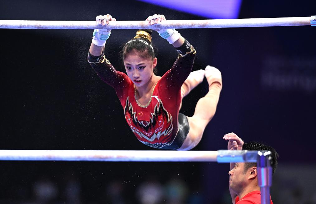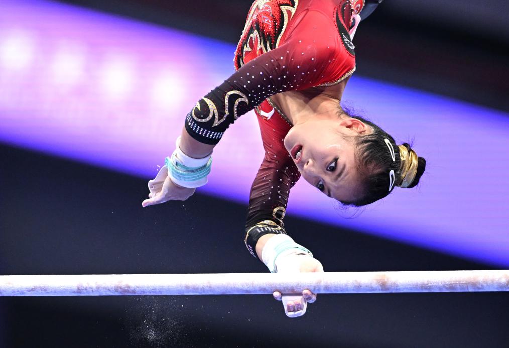 9月25日,中國隊選手左彤在高低杠項目中。新華社記者 程敏 攝