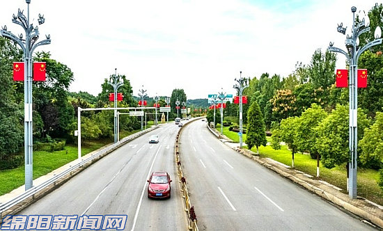 在綿梓路仙海段,沉香、黃金入口至婚慶廣場等景區(qū)主干道和重要景點,一面面鮮艷的五星紅旗迎風(fēng)招展,花叢中深紅色、淡紅色、粉紅色的鮮花隨處可見,形成一道亮麗的風(fēng)景線。