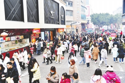 新年伊始,城區(qū)商圈人氣爆棚,客流如云,市民們喜氣洋洋,拎著大包小包滿意而歸。在城區(qū)各商場、花園市場等地,福字、對聯(lián)、燈籠以及龍年元素飾品營造出濃濃的喜慶氣氛,吸引市民選購,“煙火氣”滿滿。