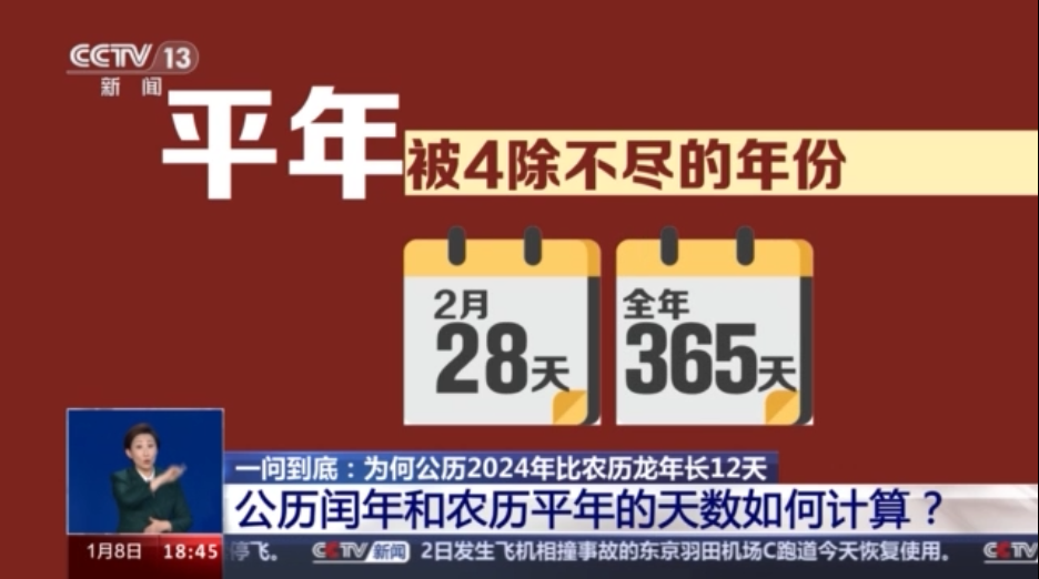 北京天文館副館長 齊銳:到了現今,我們國家的農歷的閏年置閏方式,已經不再采用古代的這種方式,是更加科學,簡單地說叫“當閏則閏”。實際上我們看這個字的本意:閏,從天文學上講就是多出一個的意思,實際上,我們知道嚴格地講是沒有閏年這個概念的,有的是閏月和閏日。公歷是什么?閏日。它是把2月多加了一天,從28天變成29天,因此公歷的2024年應該叫閏日年,簡稱閏年。而農歷,它是真正的閏月,就是農歷的這一年如果是閏年的話,那這一年就有13個月。