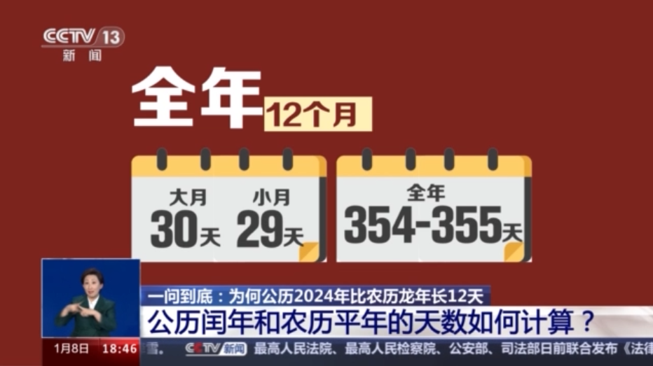 北京天文館副館長 齊銳:公歷是靠觀測太陽的運動來得到的這個歷法。因此,地球圍繞太陽運動的公轉的這個周期,我們天文學上叫回歸年,這個長度是公歷年長的決定因素。天文學觀測,我們得知,回歸年的長度是365.2422天,因此這個公歷的年長,就要向這個數值去逼近。從2024年來看,公歷是閏年,2月有29天,因此它的年長是366天。 農歷要考慮月亮的運動,因此,每個月它的月長是要看月相的陰晴圓缺的變化周期,朔望月的周期是29天半多一點,因此農歷的每個月的月長無非就是29天或者是30天,甲辰龍年,它是一個農歷上的平年,它這一年只有12個農歷月,因此年長是354天。