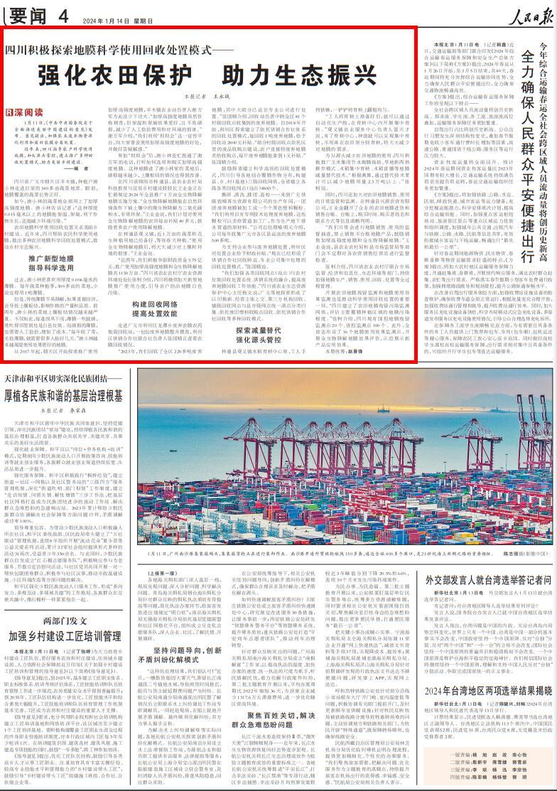 今天(1月14日)出版的《人民日報》刊發(fā)《四川積極探索地膜科學使用回收處置模式——強化農田保護 助力生態(tài)振興》的文章,聚焦四川加強農業(yè)廢棄物資源化利用和廢舊農膜分類處置,同時對綿陽等地推廣新型地膜、探索減量替代等措施進行了報道。全文如下: